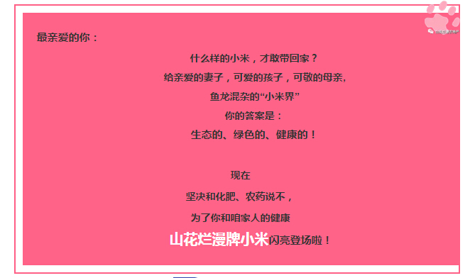為了咱家人的健康,興縣山花爛漫牌小米只施天然有機肥,決不讓一?;蔬M(jìn)農(nóng)田,絕不使用殺蟲劑、除草劑,人工種植、人工除草、人工收割,24小時追溯系統(tǒng)管理,粒粒小米精選,高品質(zhì)的保證!